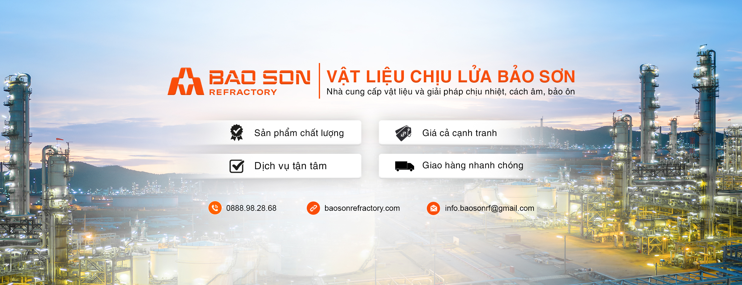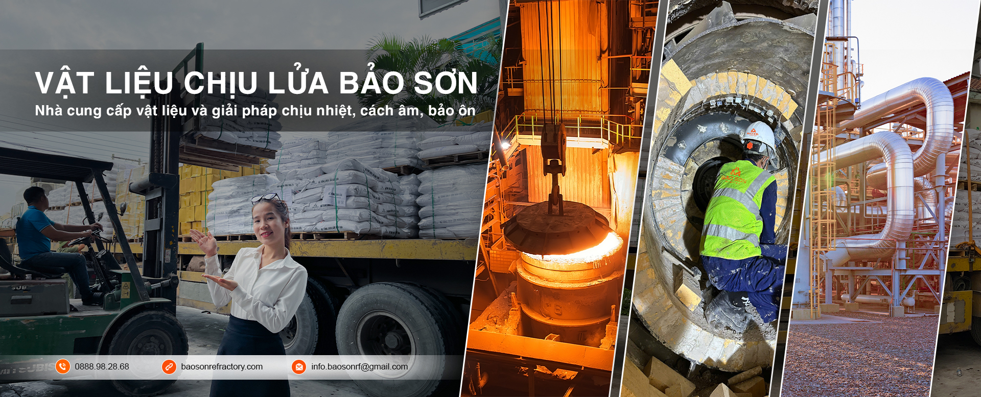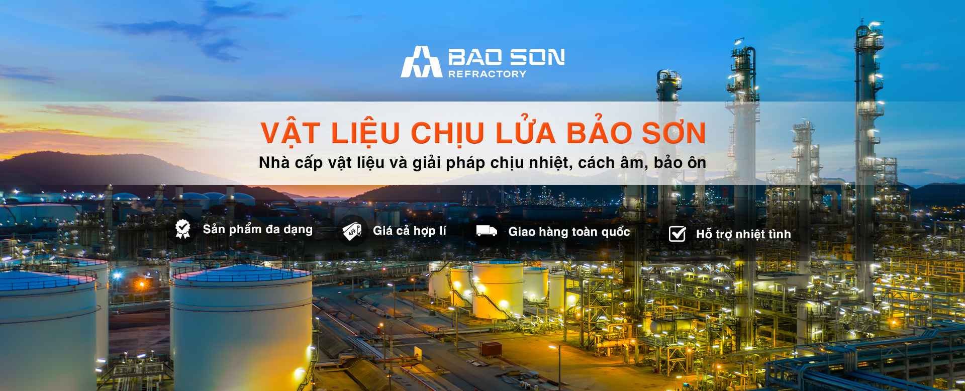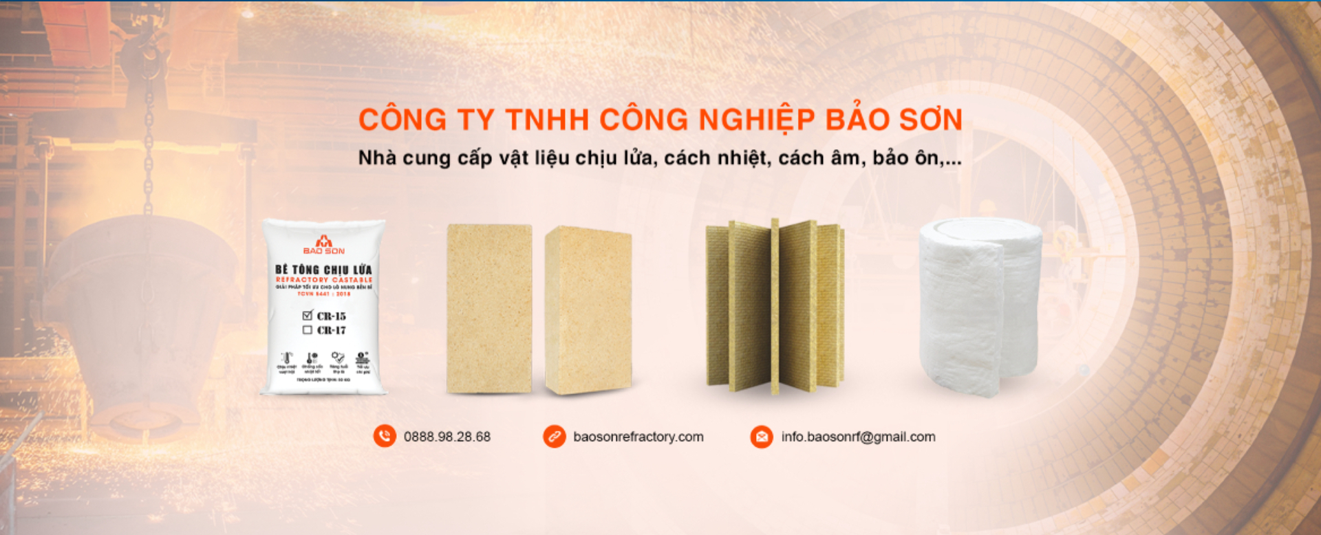 Công ty TNHH Công Nghiệp Bảo Sơn là đơn vị hoạt động chuyên sâu trong lĩnh vực vật liệu chịu lửa với hơn 18 năm kinh nghiệm. Chúng tôi cung cấp giải pháp toàn diện từ tư vấn kỹ thuật, cung ứng vật liệu và thi công lắp đặt cho các công trình công nghiệp nhiệt như lò hơi, lò nung, lò luyện kim. Với đội ngũ kỹ thuật có chuyên môn cao và mạng lưới phân phối rộng khắp, Bảo Sơn cam kết mang đến chất lưng vượt trội – hoạt động bền bỉ cho mọi công trình.